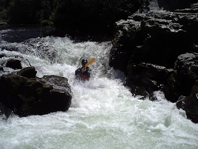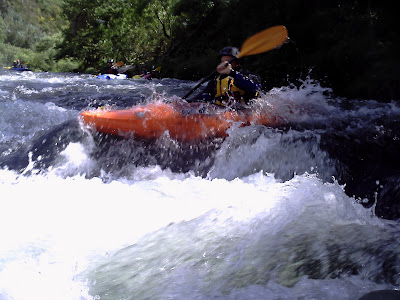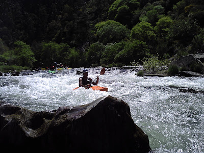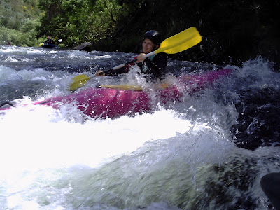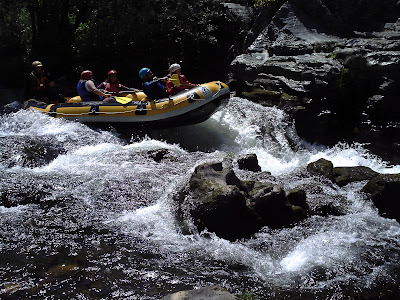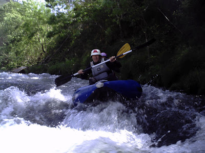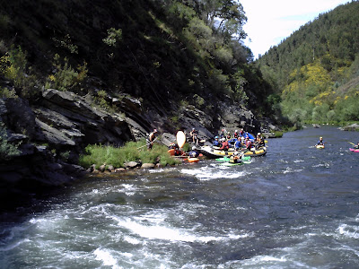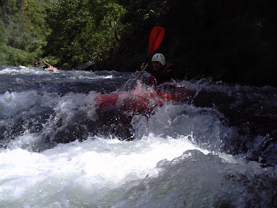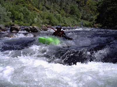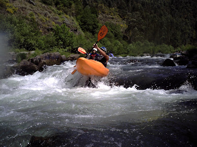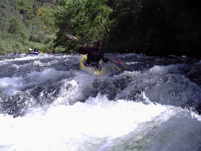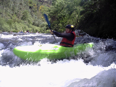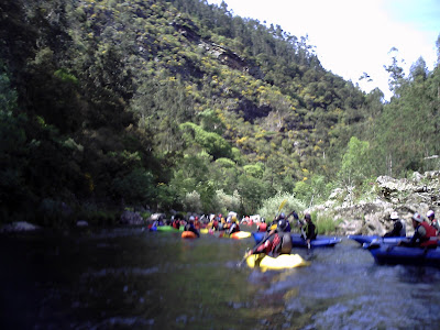 Depois de uma noite bombástika, conforme manda a tradição do Paivafest, era dia de nos dedicarmos a remar um percurso de pouca exigência técnica, combinando assim a nossa condição física com a possibilidade de todos os participantes no evento puderem descer. Sem duvida que quem olhou para o rio no domingo, entre Espiunca e Travanca, deve ter ficado deliciado com o cenário que se figurava ao longo daqueles 9 Km. Dezenas de kayaks juntamente com canoas raft e um raft deram cor a um domingo solarento e bastante quente. Certo que para muitos canoistas este troço está mentalmente ligado ao Paiva com um caudal muito forte, no entanto para aqueles que estão agora a dar as primeiras pagaiadas mais bravas esta descida é a mais indicada. Sem perigos e com passagens de classe III e III+ serve perfeitamente para contentar canoistas experientes e menos experientes. Muitos foram os "experts" que de vez em quando lá iam dando dicas aos "tenrinhos" (Pires vocabulário), e estes por sua vez iam absorvendo a informação. Destaque para a malta do Hélder e do Roscas que para além de serem bastantes já tratam os barcos quase por tu. Mais umas descidas, e umas noções básicas, e temos neste grupo muita malta porreira a remar com atitude de quem quer triunfar. Continuem !!! Torres Vedras Rules !!!